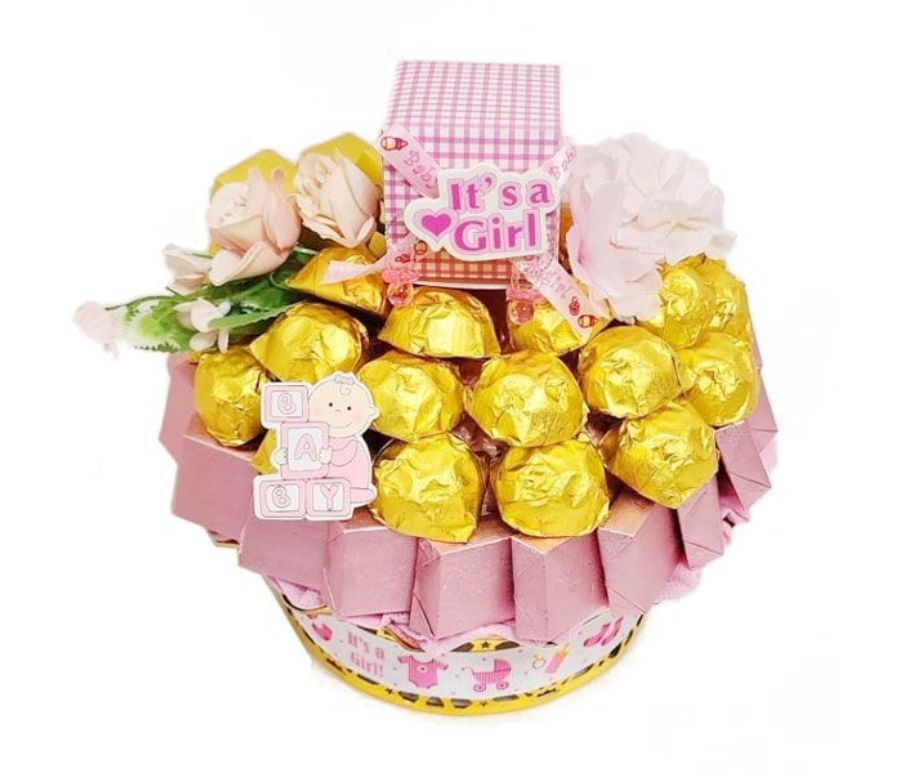 A beautiful arrangement of Belgian milk chocolates decorated to celebrate the new arrival of new Baby