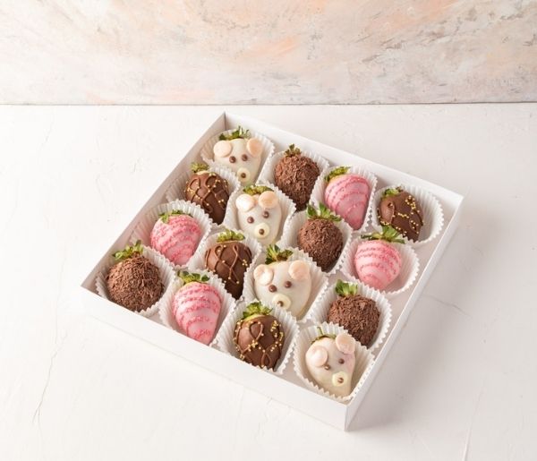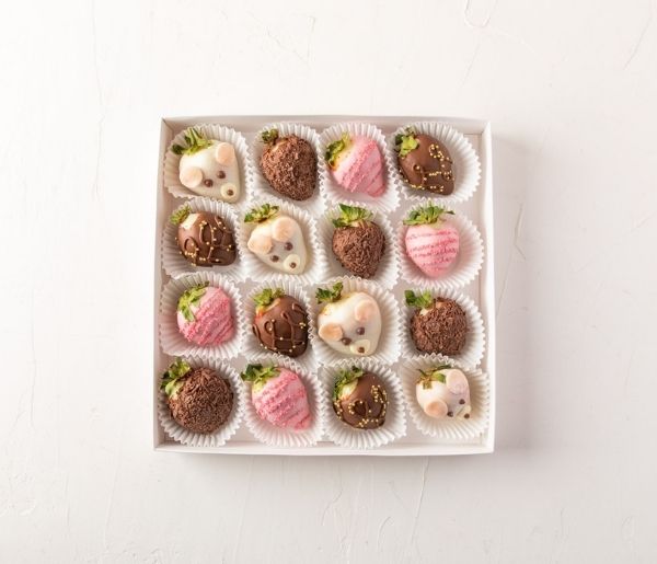 • 16 pieces chocolate covered strawberries in White, Ruby and Milk Chocolate