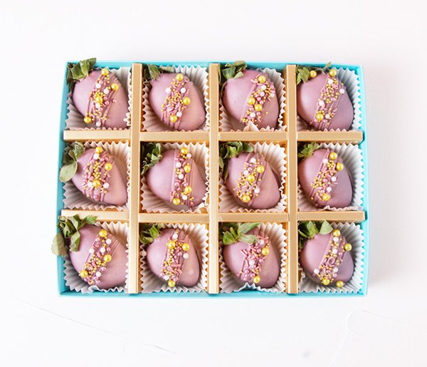 - 12 pieces chocolate covered strawberries in colored chocolate, hand designed in a unique, glamorous way.
