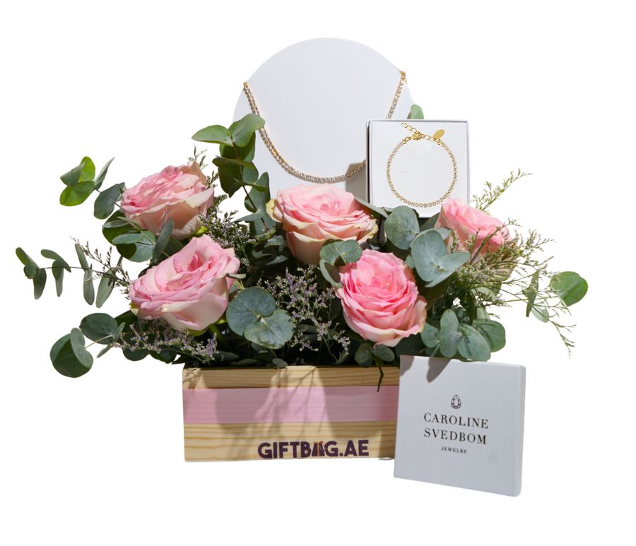 The Bloomed in Crystal arrangement is a perfect blend of timeless jewelry and graceful blooms. Featuring Caroline Svedbom jewelry surrounded by 5 soft pink roses, 2 stems of limonium, and fresh eucalyptus leaves, this gift transforms elegance into an unforgettable experience.