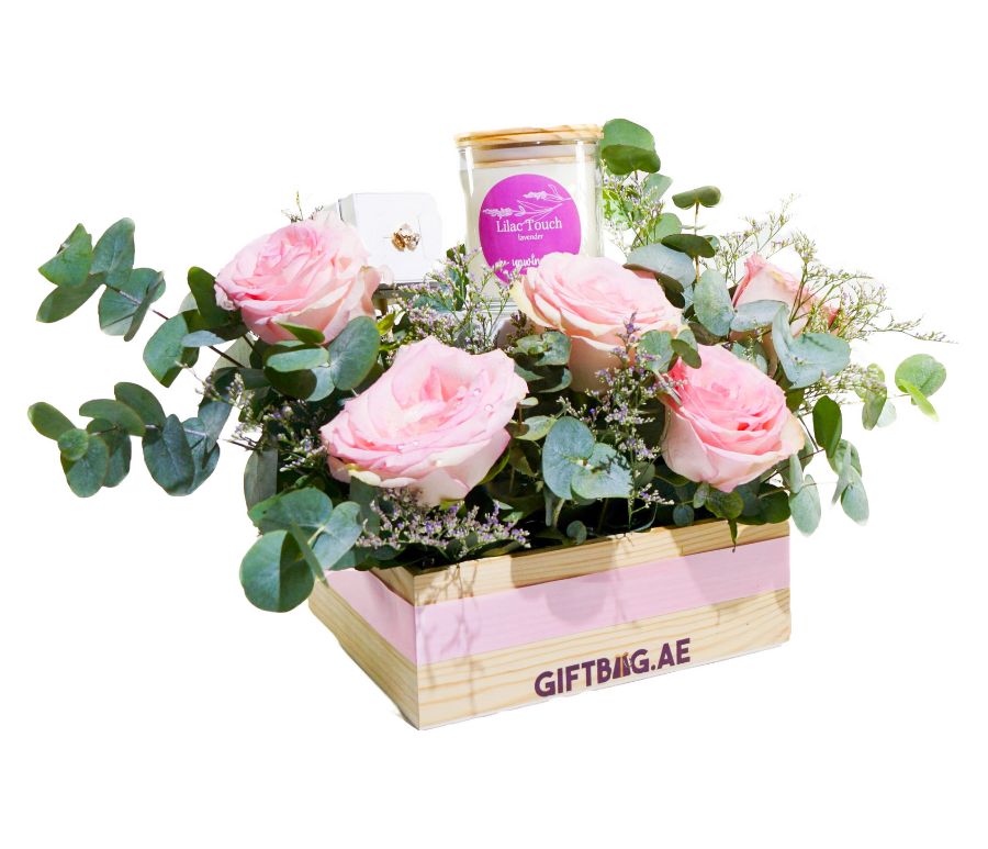 Five delicate pink roses, accented with limonium and fresh eucalyptus leaves, are arranged beautifully in a rustic wooden crate for a fresh, natural look.