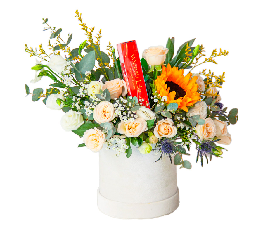 A delightful combination of floral beauty and sweet indulgence, this arrangement is a perfect gift for any occasion. Featuring a vibrant sunflower, 3 delicate baby roses, 3 eustoma, 2 baby breath, 1 limonium, 3 eucalyptus, 2 eryngium, and a selection of assorted chocolate pralines, this bouquet offers a harmonious blend of colors and textures. The sweet fragrance of the flowers and the rich taste of the chocolates create a truly unforgettable experience.