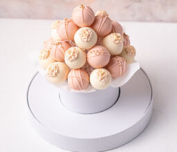 Alternate layers of our chocolate and vanilla cake topped with our famous Belgian chocolate ganache and vanilla buttercream swirl.