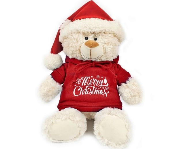 Super soft fluffy christmas bear with trendy red hoodie and cute santa hat. Size 38cm. Ideal for Christmas gifting, boys, girls, family festivities and celebrations.