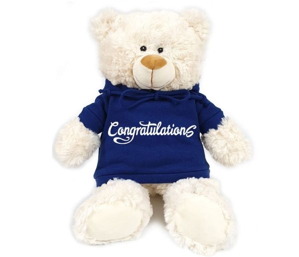 Supersoft, cuddly cream bear with trendy blue hoodie Congratulations Size 38cm.Ideal for baby birth, graduations, special occasions, engagement, marrriage, and celebrations of special events. Send a special message to your boyfriend, girlfriend, busband, wife or in friendship. Ideal for boys, girls, and adults.