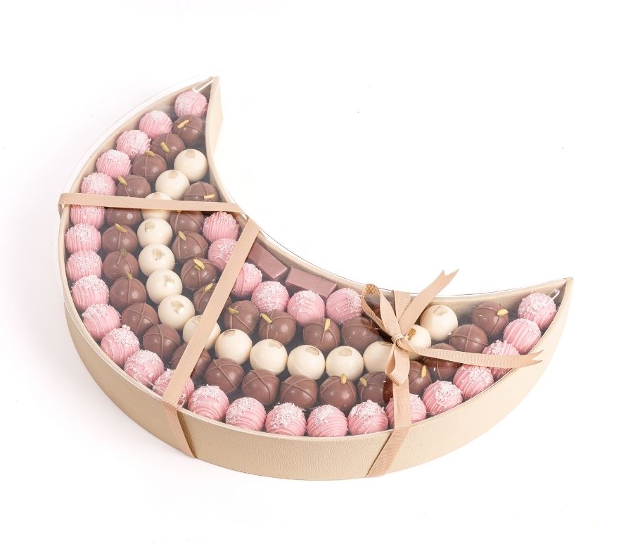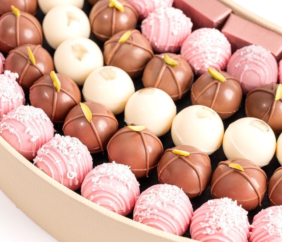 Sugar, cocoa butter, cocoa mass, whole milk powder, assorted fillings (ganache, pralines, nut pastes, natural flavour infusions), emulsifier (soy lecithin), natural vanilla flavor.
