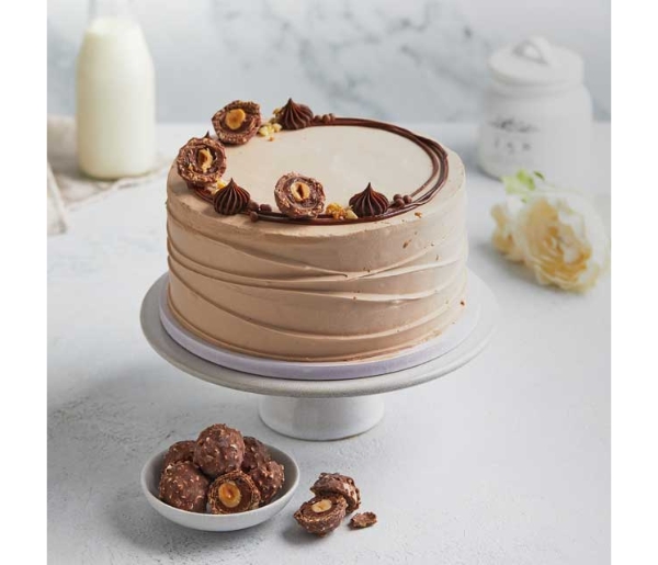 Our Ferrero Rocher Cake showcases rich chocolate sponge, layered with velvety ganache, crushed Ferrero Rocher, and silky Nutella. Topped with Nutella buttercream ruffles, this artisanal masterpiece elevates every celebration. Order now to make your occasion unforgettable!