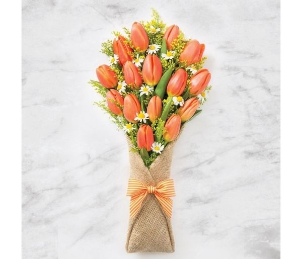 15 Orange Tulips,2 Stems of White Aster,4 Stems of Solidaster,Hand Tied Bouquet in Natural Jute Wrapping and a Ribbon Bow.
