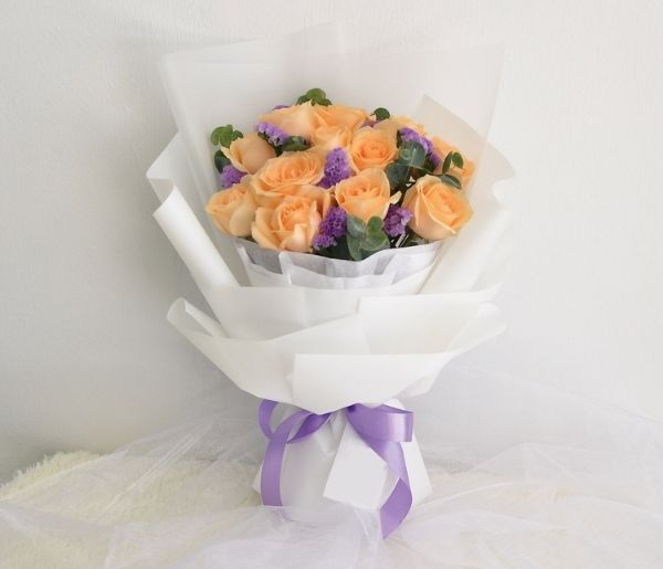 12 Peach Roses,2 Stems of Purple Statice,Eucalyptus Leaves,Wrapped in White Colour Wrapping and a Ribbon Bow.