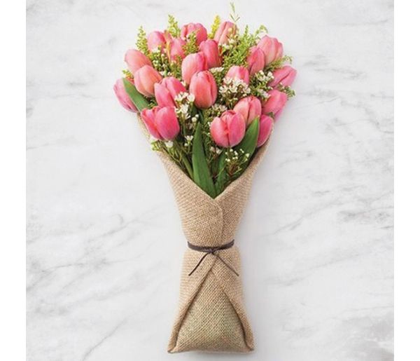 20 Dark Pink Tulips,2 Stems of White Wax Flowers,3 Stems of Solidaster,Hand Tied Bouquet in Natural Jute Wrapping,Tied with a Raffia Bow.