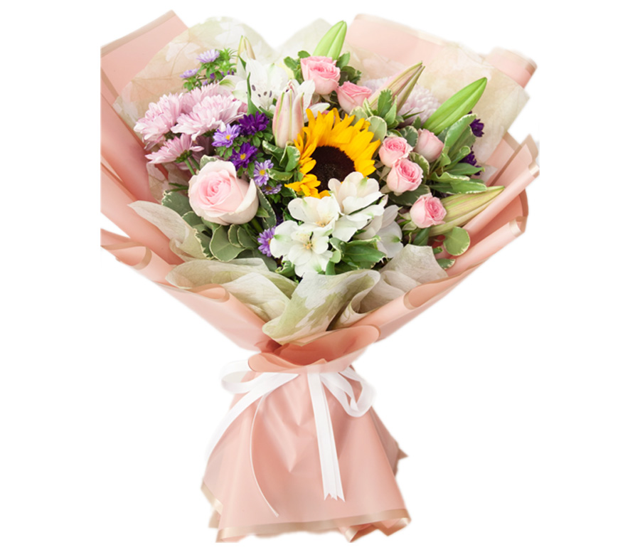 A vibrant symphony of colors awaits with our Floral Fantasy bouquet. This stunning arrangement features a captivating blend of 2 chrysanthemums, 2 alstroemeria, 3 asters, 1 lily, 2 baby roses, 1 sunflower, and 3 pittosporum. The soft pink hues, sunny yellow, and refreshing whites create a harmonious and uplifting atmosphere. Perfect for birthdays, anniversaries, or simply to brighten someone’s day, this exquisite bouquet is a testament to the beauty and joy of nature.