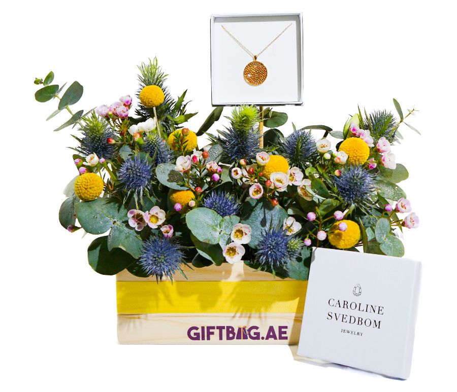 Seven sunny caspedia, three striking eringium, and soft pink and white wax flowers are paired with fresh eucalyptus leaves, all arranged beautifully in a rustic wooden crate for a bright, uplifting look.