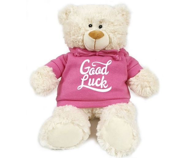 Supersoft, cuddly cream bear with trendy pink hoodie. Good Luck. Size 38cm. Ideal for baby birth, graduations, special occasions, engagement, marriage, and celebrations of special events. Send a special message to your boyfriend, girlfriend, busband, wife or in friendship. Ideal for boys, girls, and adults.