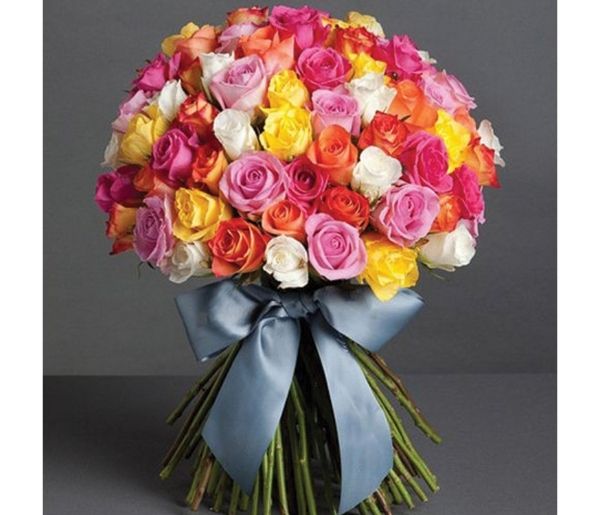 30 Orange Roses,25 Pink Roses,15 White Roses,15 Dark Pink Roses,15 Yellow Roses,Hand Bunch Tied with a Ribbon Bow.