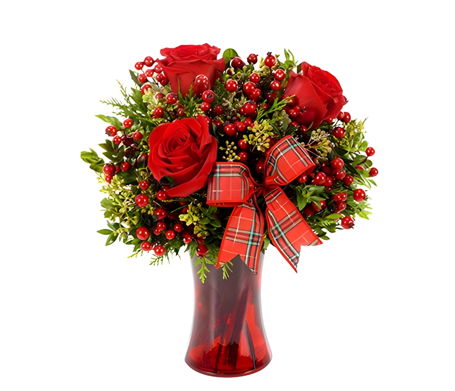 Close your eyes and somehow you can just see the snow falling and hear the sleigh bells ringing. Now open them to behold the incarnation of what you just imagined…the perfect winter wonderland arrangement of red roses, berries and a plaid ribbon in a glass gathering vase.