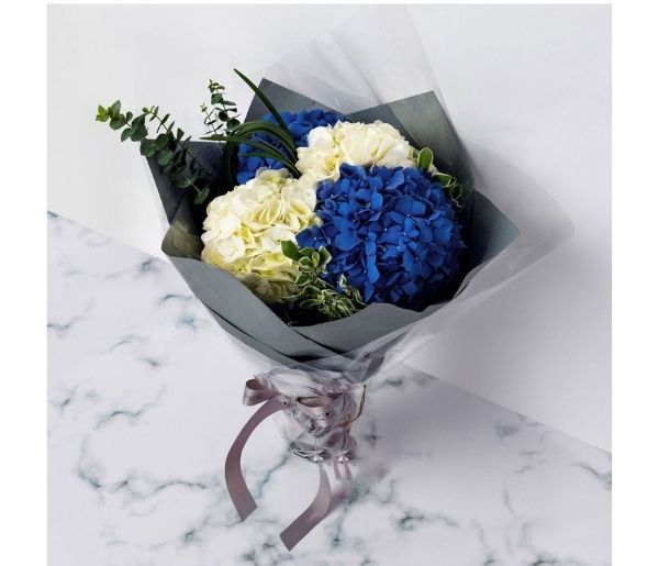 2 Blue Hydrangea,2 White Hydrangea,Leaves and Fillers – Eucalyptus, Pittosporum and Flexi Grass,Contrast Wrapping and a Satin Ribbon Bow.