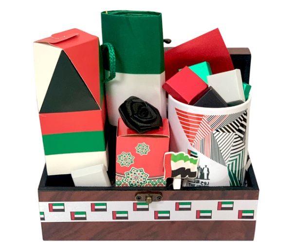 Wrapped in cellophane and tied with UAE Flag colour ribbons