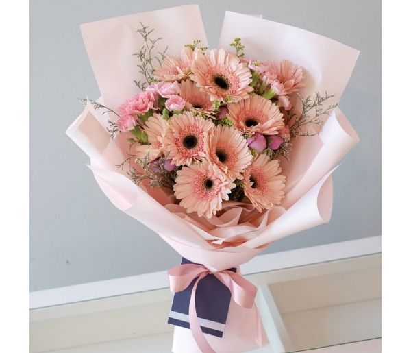 10 Peach Gerberas,2 Stems of Pink Spray Carnations,2 Stems of Pink Spray Roses,Fillers – Limonium and Solidaster,Matching Wrapping and a Ribbon Bow.