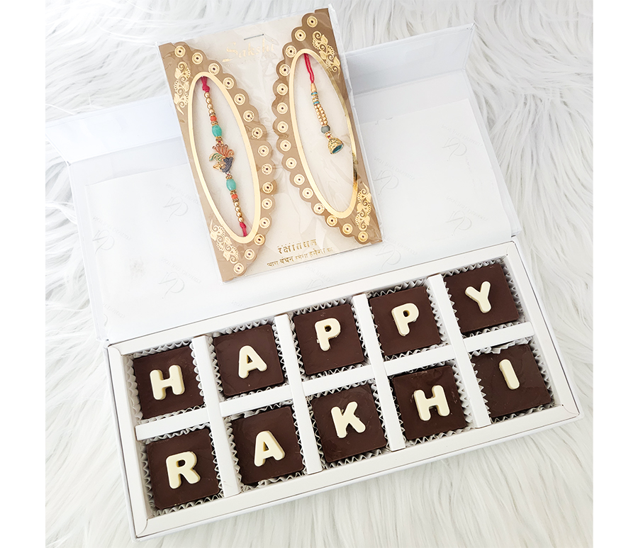 Celebrate the cherished bond of love with your brother and sister-in-law with our exquisite Rakhi and Lumba Set. This elegant set includes a beautifully crafted Rakhi for your Bhai and a matching Lumba for your Bhabhi, symbolizing the harmonious relationship you share with both. Complementing this duo is a delightful box of 10 pieces of Belgian Milk Chocolatesthat say HAPPY RAKHI, each piece carefully crafted to melt in your mouth and spread happiness.