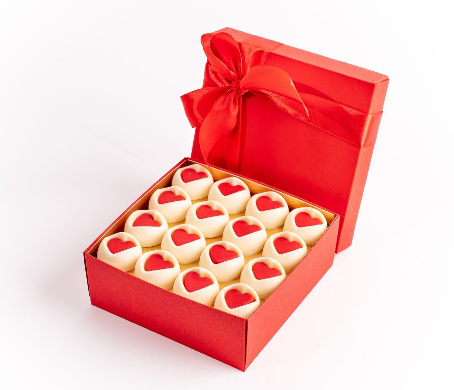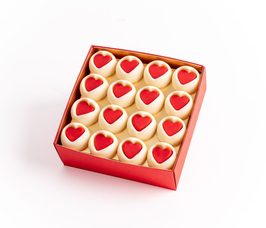 – White Chocolate (Sugar, Cocoa Butter, Whole Milk Powder, Emulsifier: Soy Lecithin, Natural Vanilla Flavoring), Food Coloring (E129, E171 for red hearts). White Chocolate contains Cocoa Solids 28% minimum, Milk Solids 22% minimum.