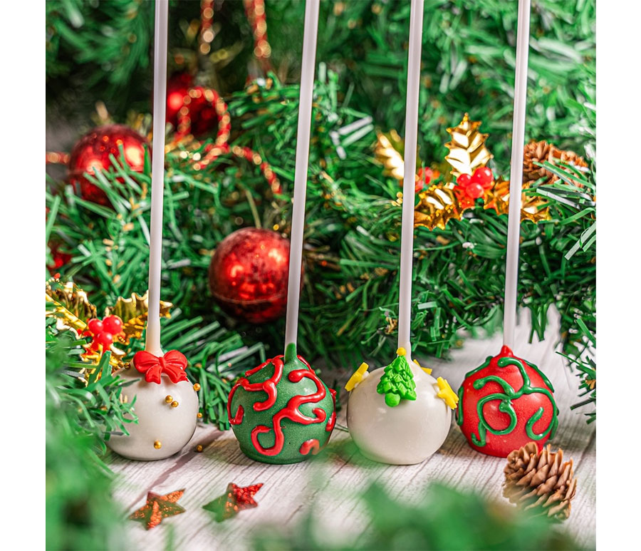 Chocolate Truffle Cakepops coated with white chocolate and in a festive décor